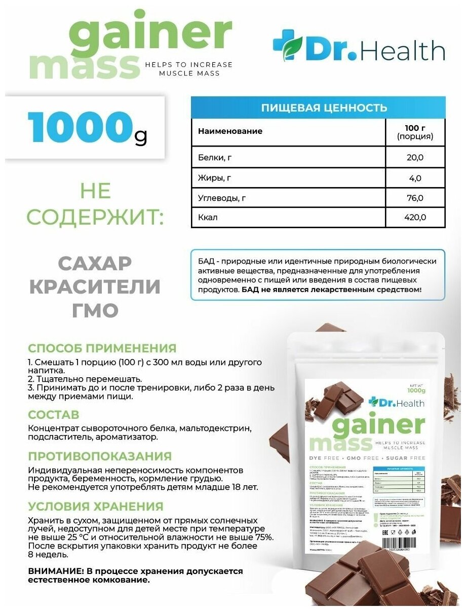 Dr. Health Гейнер высокоуглеводный быстрый со вкусом Шоколад 1000г интересное: