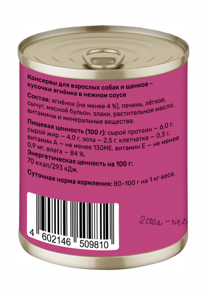Консервы для взрослых собак и щенков кусочки ягненка в нежном соусе 22ел16 43736