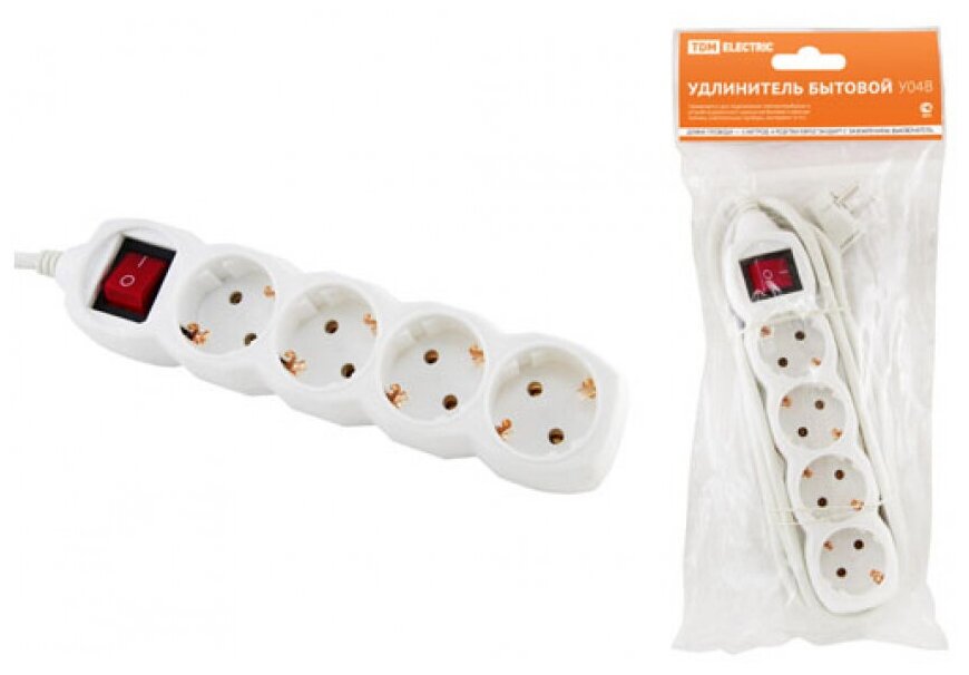 Удлинитель бытовой У04В ,с выключателем, 4 гнезда, 5 метров, с заземлением, ПВС 3х1мм2 16А/250В TDM SQ1303-0112 (1 шт.)