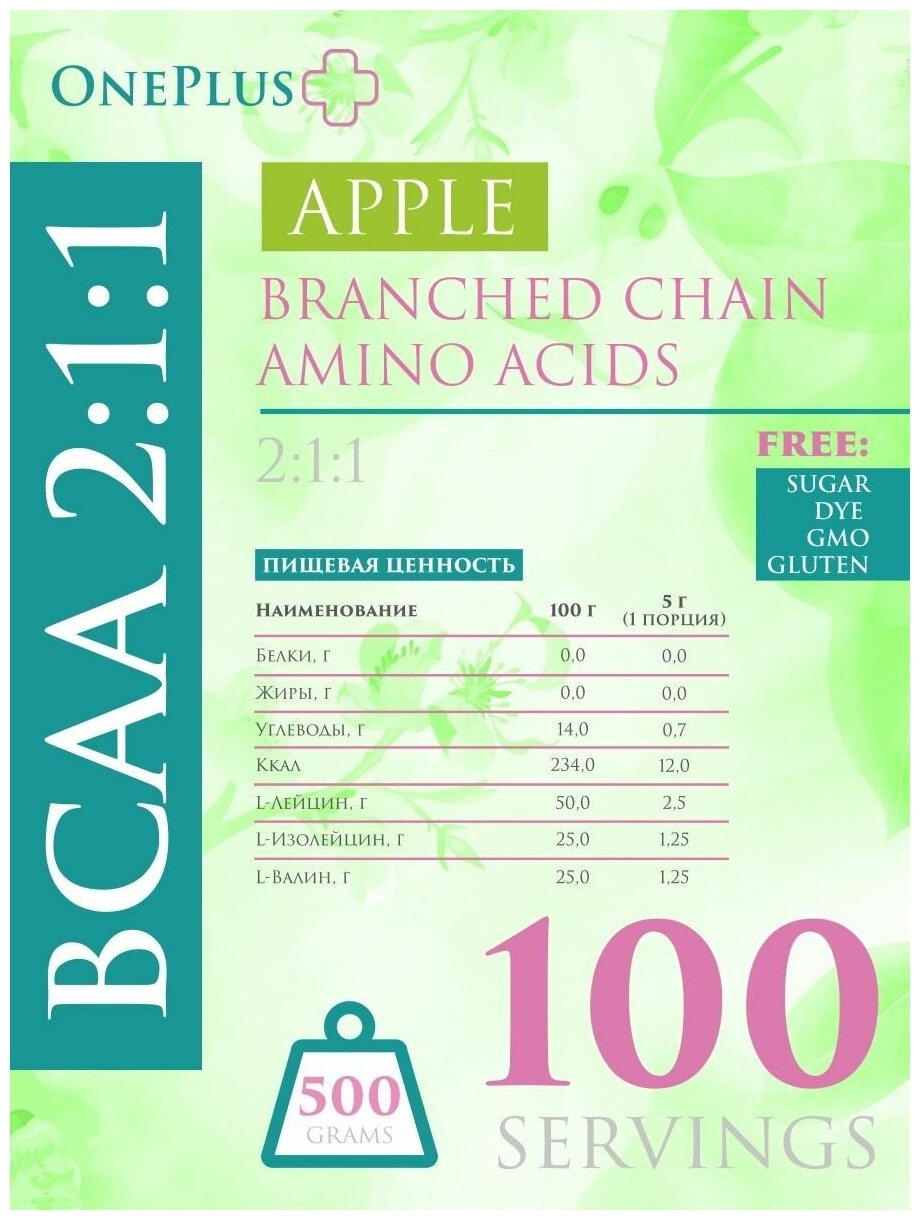 Купить One Plus BCAA 2:1:1 порошок со вкусом Яблоко 500г