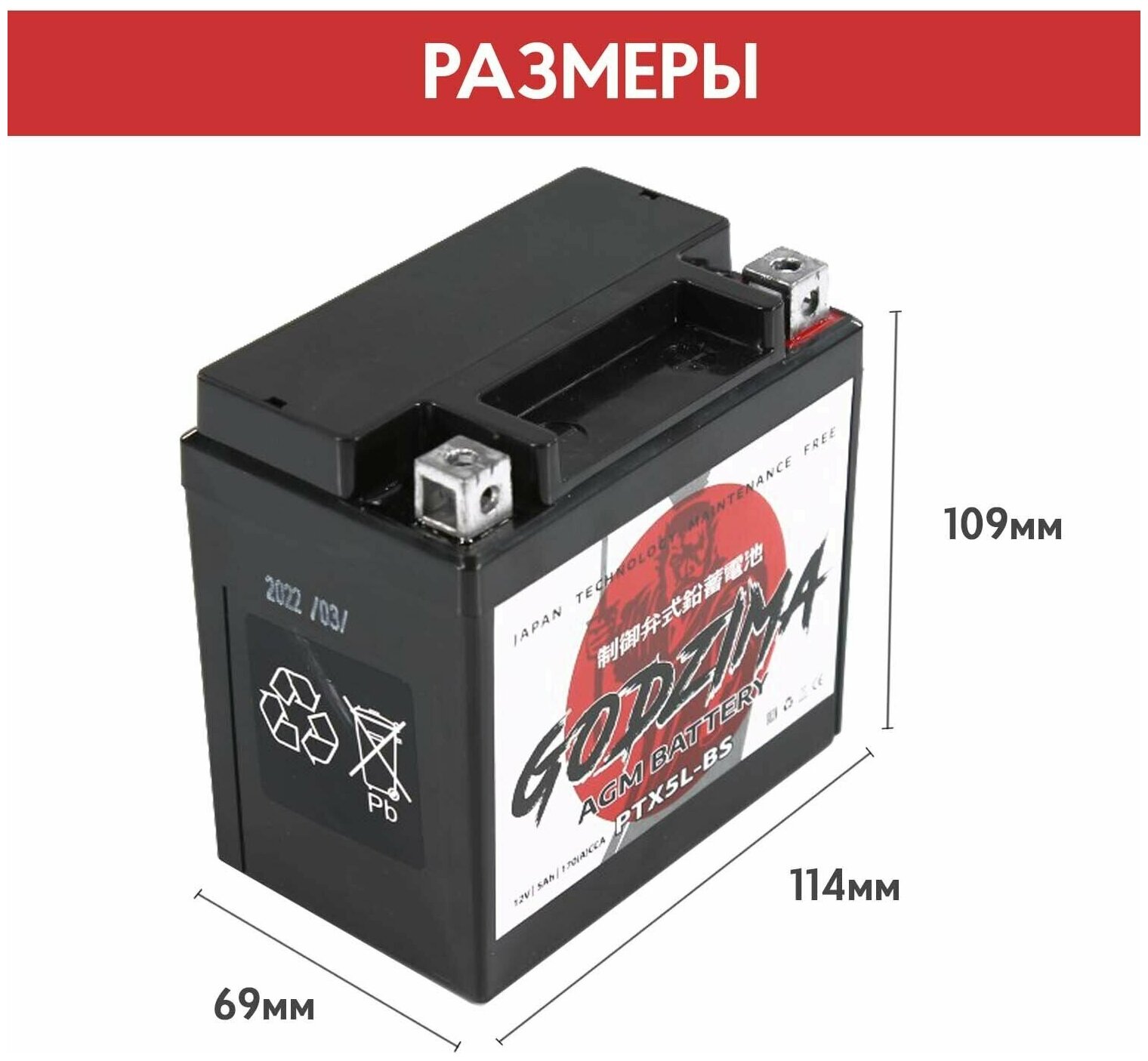 Мото аккумулятор Godzima GTX5L-BS (YTX5L-BS, CT 1205) стартерный для мотоцикла, квадроцикла, скутера AGM 12V 5 а/ч интересное: