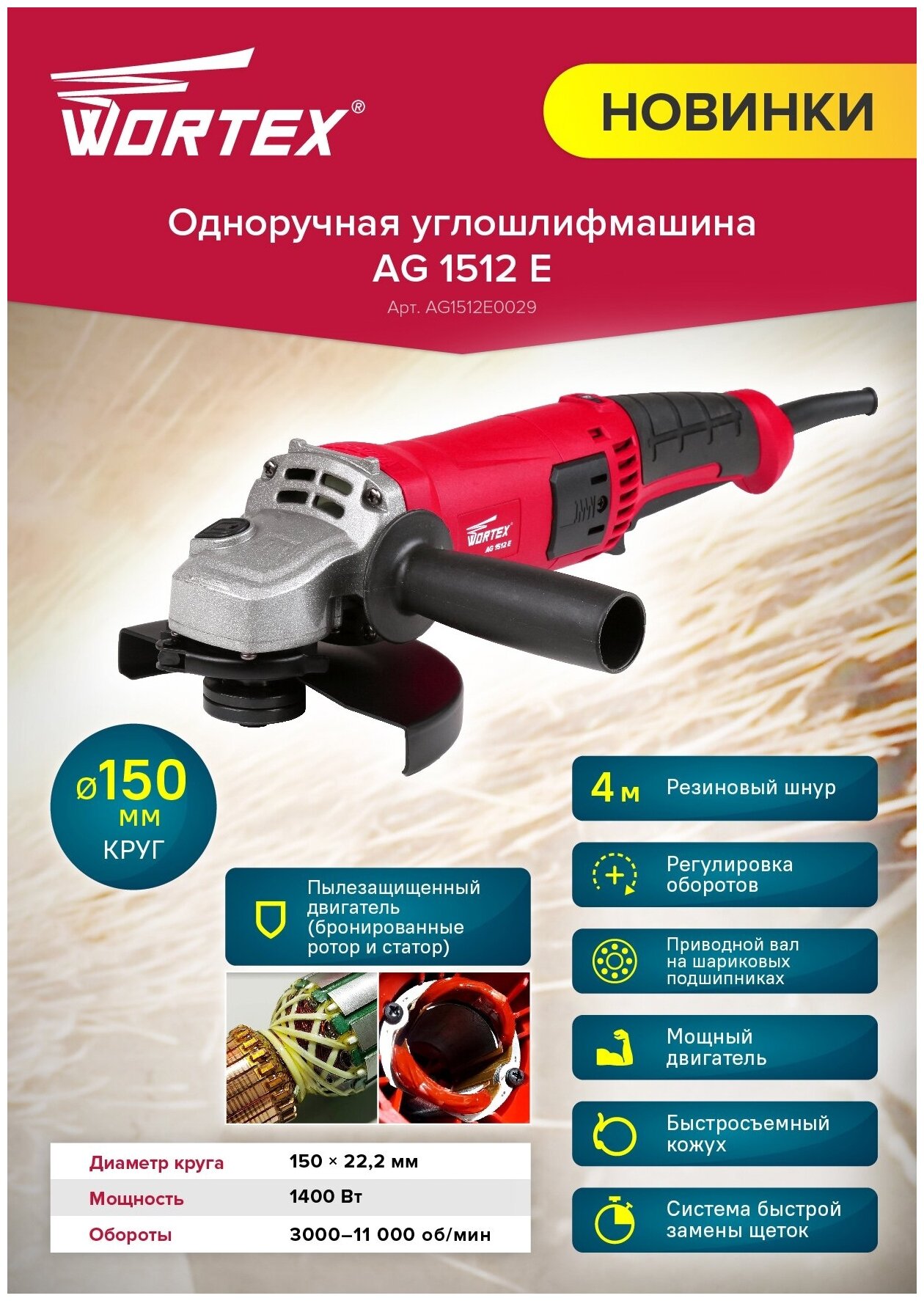 Одноручная углошлифмашина WORTEX AG 1512 E в кор. 1400 Вт, 150 мм, 0-11000 об/мин (рег. об., пылезащита двигателя и подшипника, шнур 4 м) (AG1512E0029
