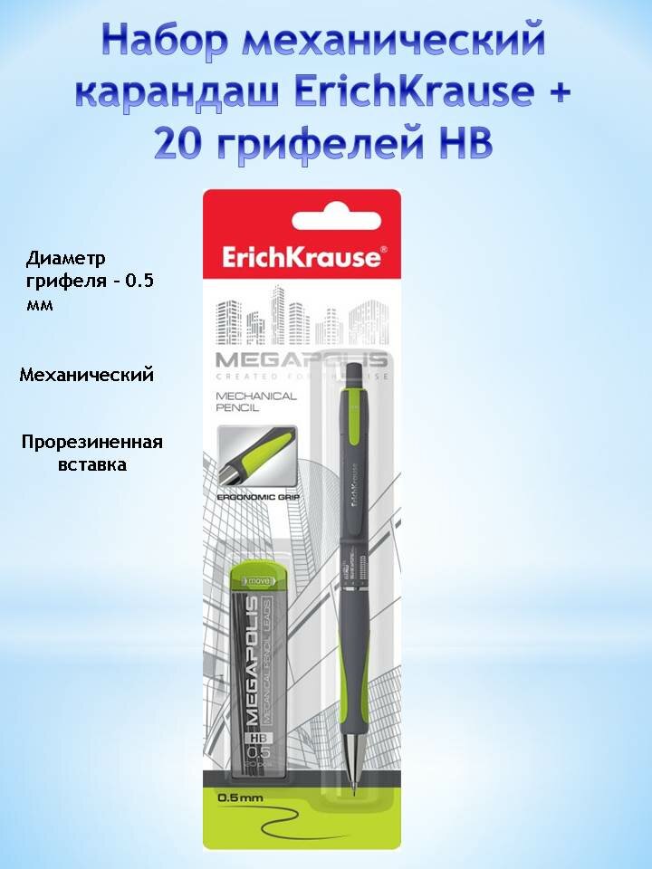ErichKrause Набор карандаш механический 0.5 мм HB + 20 грифелей Erich Krause MEGAPOLIS CONCEPT, блистер, резиновый упор, микс