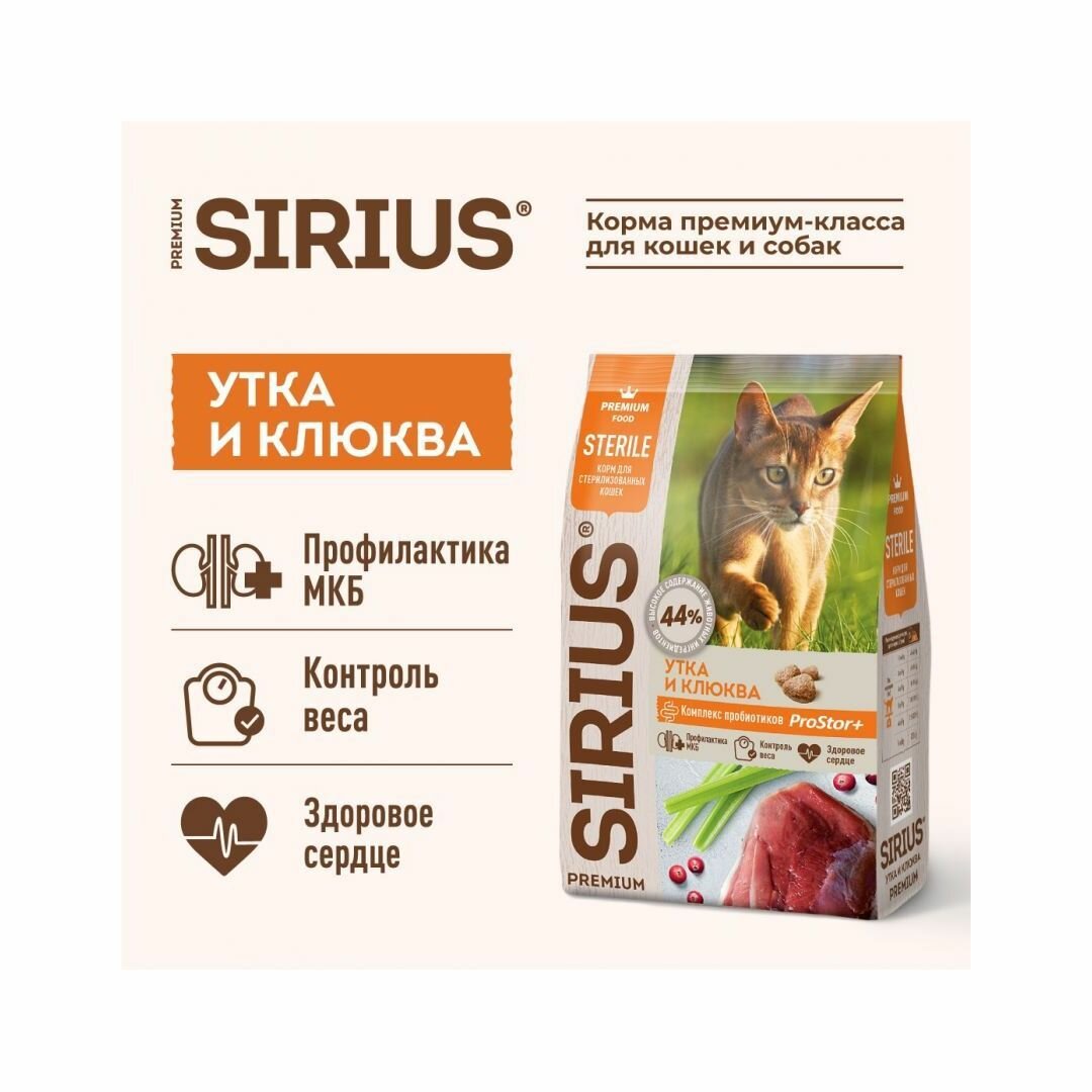 Сухой корм Sirius для стерилизованных кошек, полнорационный, утка и клюква 1.5 кг