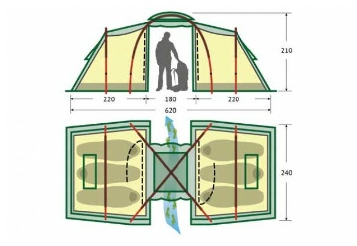 Тамбур ооочень маленький!!!Если бы мы ставили вторую комнату,то в тамбуре можно было бы только рюкзаки хранить!Без комнаты мы устроили в тамбуре кухню и всё время ходили согнутые! Окошки малюсенькие+палатка не дышит,находиться там было нормально только ночью,днём там как в бане!Это при том что мы были в лесном масиве и прямое солнце попадало к нам на 1-1.5часа в день,на берегу озера. |