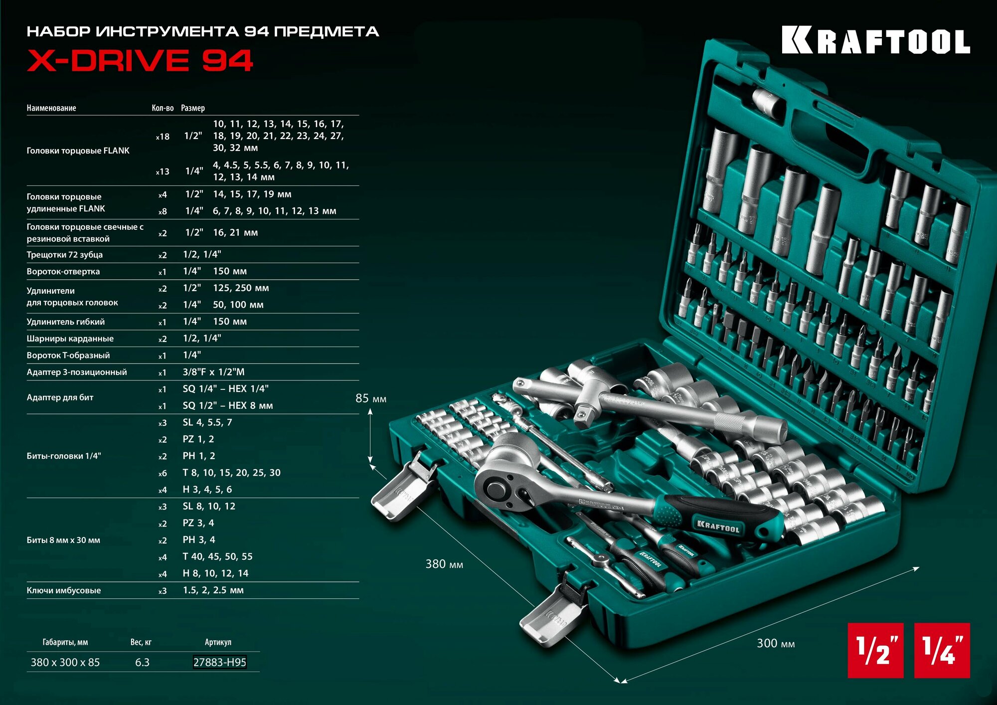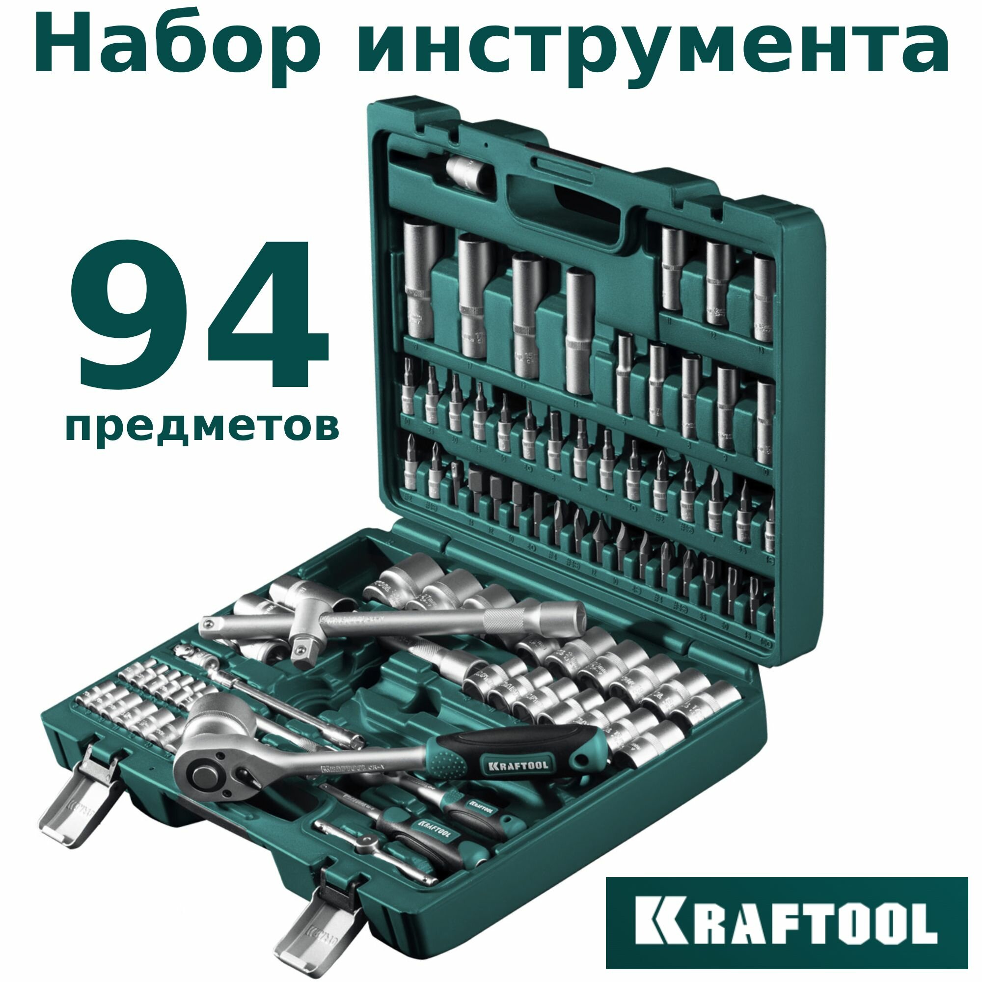 KRAFTOOL X-Drive 94, 94 предм., (1/2″+1/4″), универсальный набор инструмента (27883-H95)
