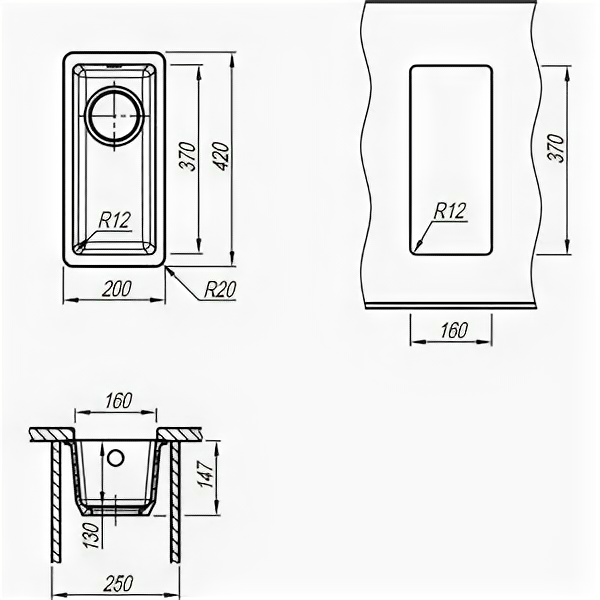Чаша для мойки прямоугольная Флорентина Вега 160 Антрацит (22.300.00160.302)