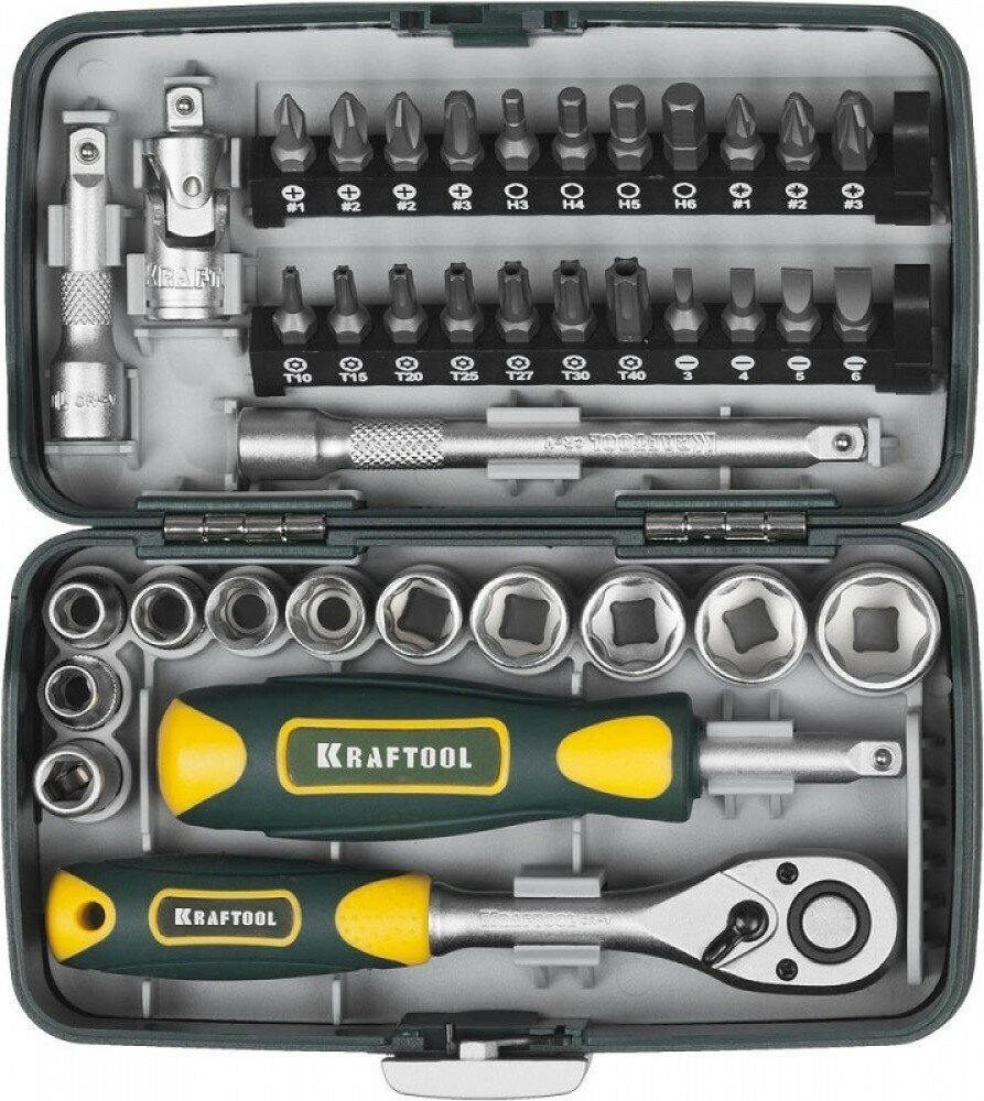 Набор бит и торцевых головок Kraftool (38 шт.)Торцовые головки – 10 шт., Адаптер для бит – 1 шт., Биты 22 шт., Удлинитель для торцовых головок – 1 шт., Трещотка -1 шт., Вороток – отвертка с двухкомпонентной рукояткой – 1 шт., Шарнир квадратный – 1шт.