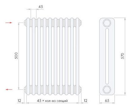 Трубчатый радиатор Arbonia 2057, 12 секций, боковое подключение, без накладок