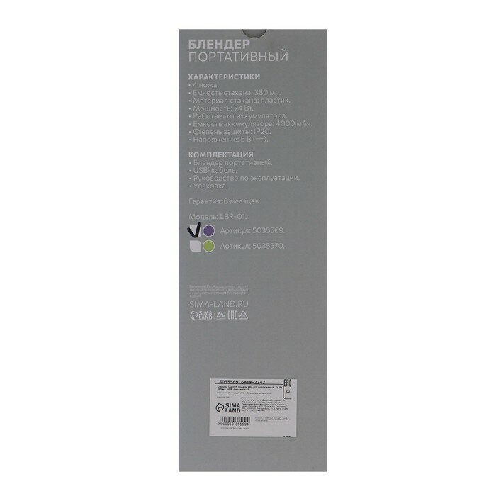 Блендер LuazON LBR-01, погружной, 500 Вт, 0.3/0.6 л, 2 скорости, фиолетовый Luazon Home 2813365