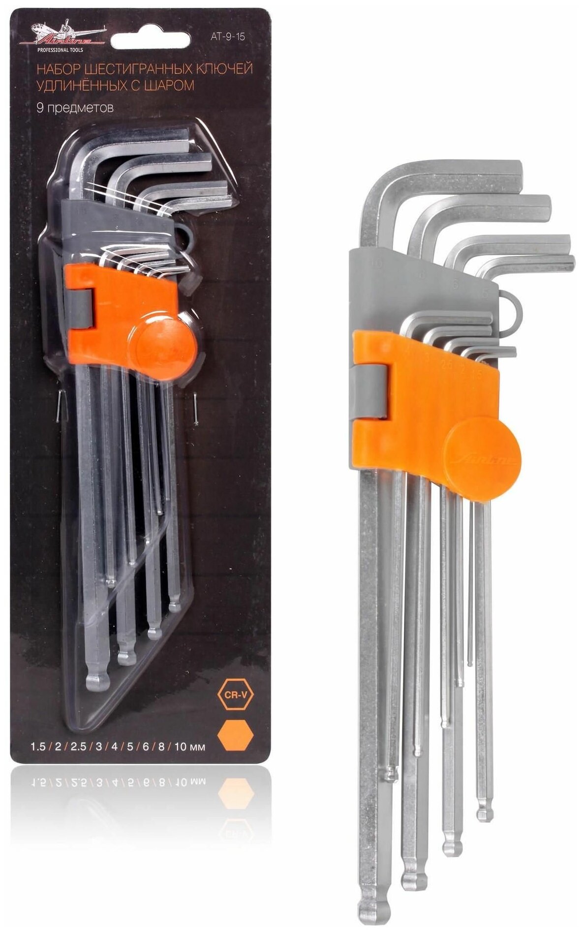 AT915 AIRLINE Набор шестигранных ключей удлинённых инбус с шаром 9 предметов (1.5 2 2.5 3 4 5 6 8 10мм) пласт.подв