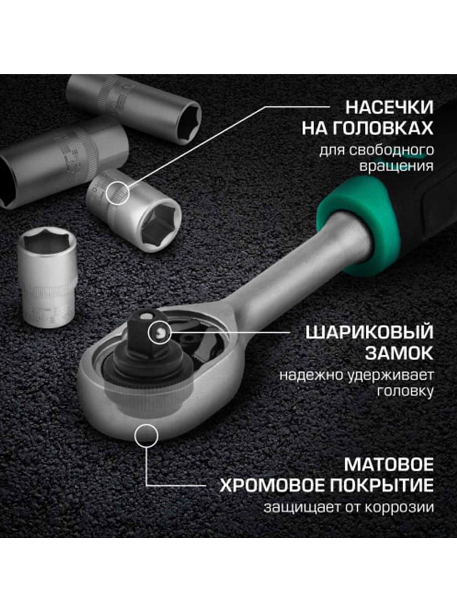 | Головки торцевые подробно | 1/2": 10, 11, 12, 13, 14, 15, 17, 19, 22, 24, 27, 30, 32; 1/4": 4, 5, 6, 7, 8, 9, 10, 11, 12, 13; 1/4" удлиненные: 5, 6, 7, 8, 9; свечные 16 мм и 21 мм |
