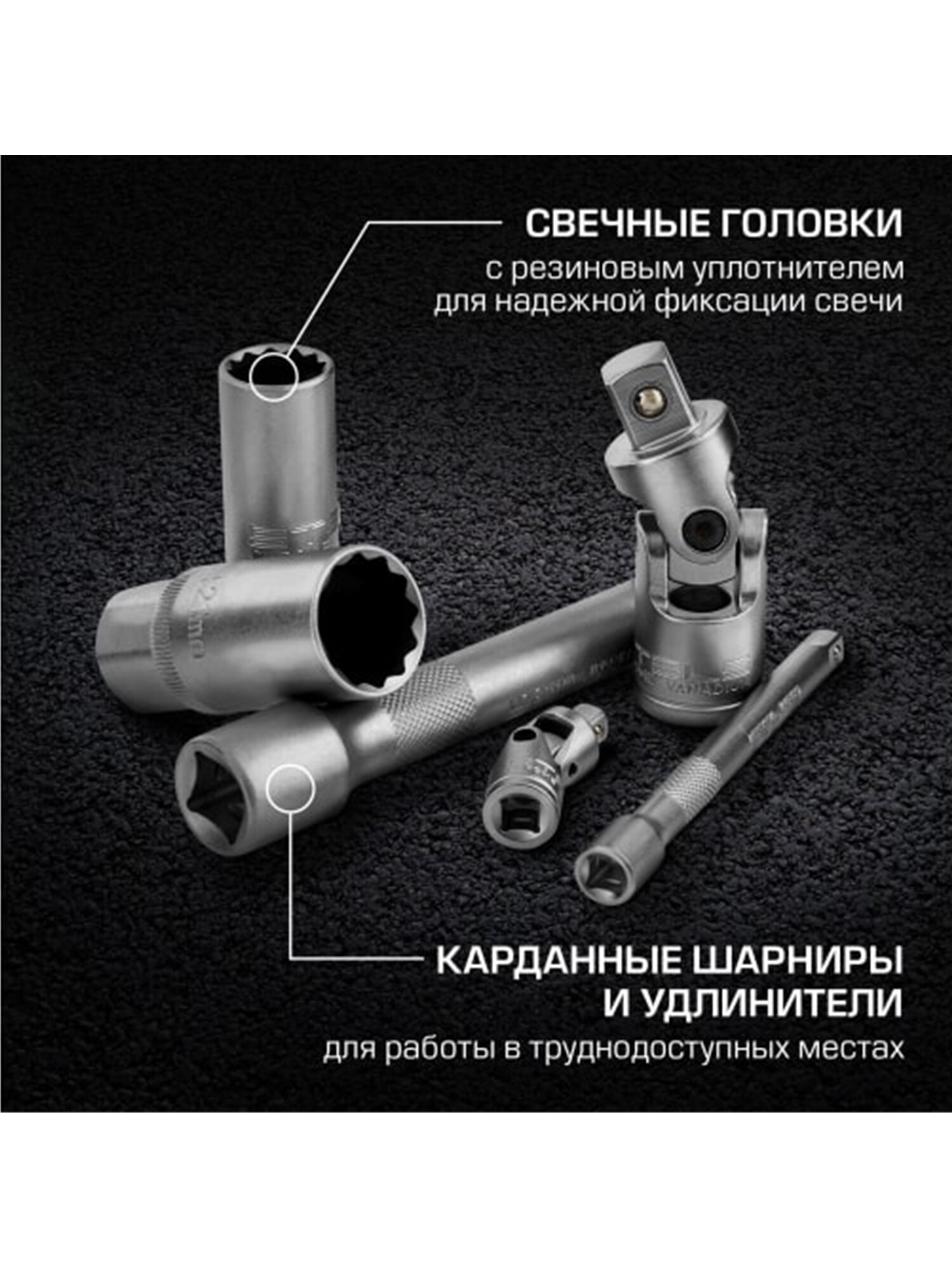 | Дополнительная информация | кардан 1/2", кардан 1/4", удлинитель 1/2",удлинитель 1/4", отвертка-держатель 1/4", переходник для бит 1/4", вороток Т-образный 1/2" |