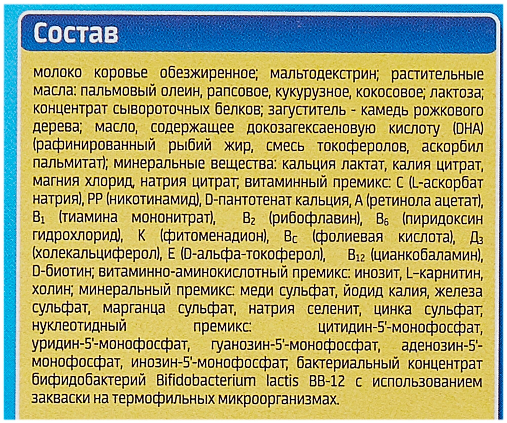 | Состав | молоко коровье обезжиренное, молочный сахар, мальтодекстрин, растительные масла: пальмовый олеин, рапсовое, кукурузное, кокосовое,… концентрат сывороточных белков, масло для детского питания, содержащее докозапентакновую кислоту (докозагексаеновая кислота (DHA), эйкозапентаеновая кислота (EPA), подсолнечное масло, витамины: концентрат смеси альфа-токоферолов, аскорбил пальмитат, лимонная кислота); масло, содержащее арахидоновую кислоту (ARA), загуститель камедь рожкового дерева; минеральные вещества; витаминный премикс; аминокислотный премикс: инозит, L- карнитин, таурин; минеральный премикс: ; нуклеотидный премикс: цитидин-5-моносфосфат, уридин-5-монофосфат, гуанозин-5-монофосфат, аденозин-5-монофосфат, инозин-5-монофосфат; бактериальный концентрат бифидобактерий Bifidobacteriuum lactis BB12 ещёскрыть |