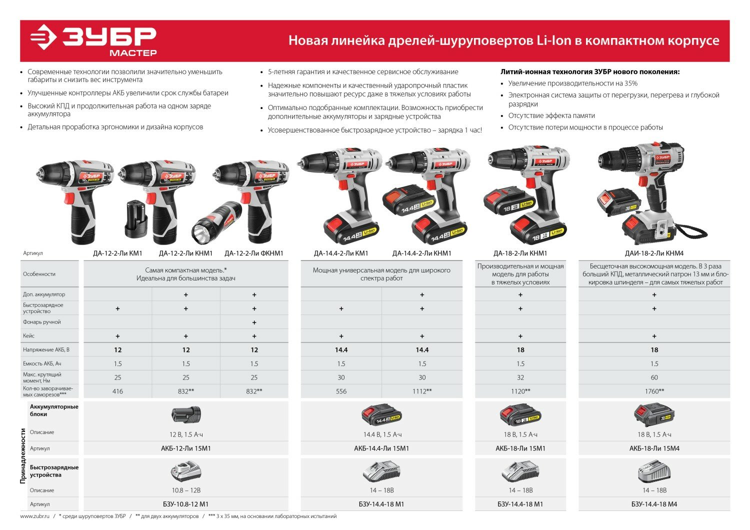 Ниже Вы можете прочитать отзывы на Шуруповерт ЗУБР Мастер ДА-14,4-2-Ли КМ1, ознакомится с подробными характеристиками, посмотреть интересные обзоры и фотографии на Шуруповерт ЗУБР Мастер ДА-14,4-2-Ли КМ1.