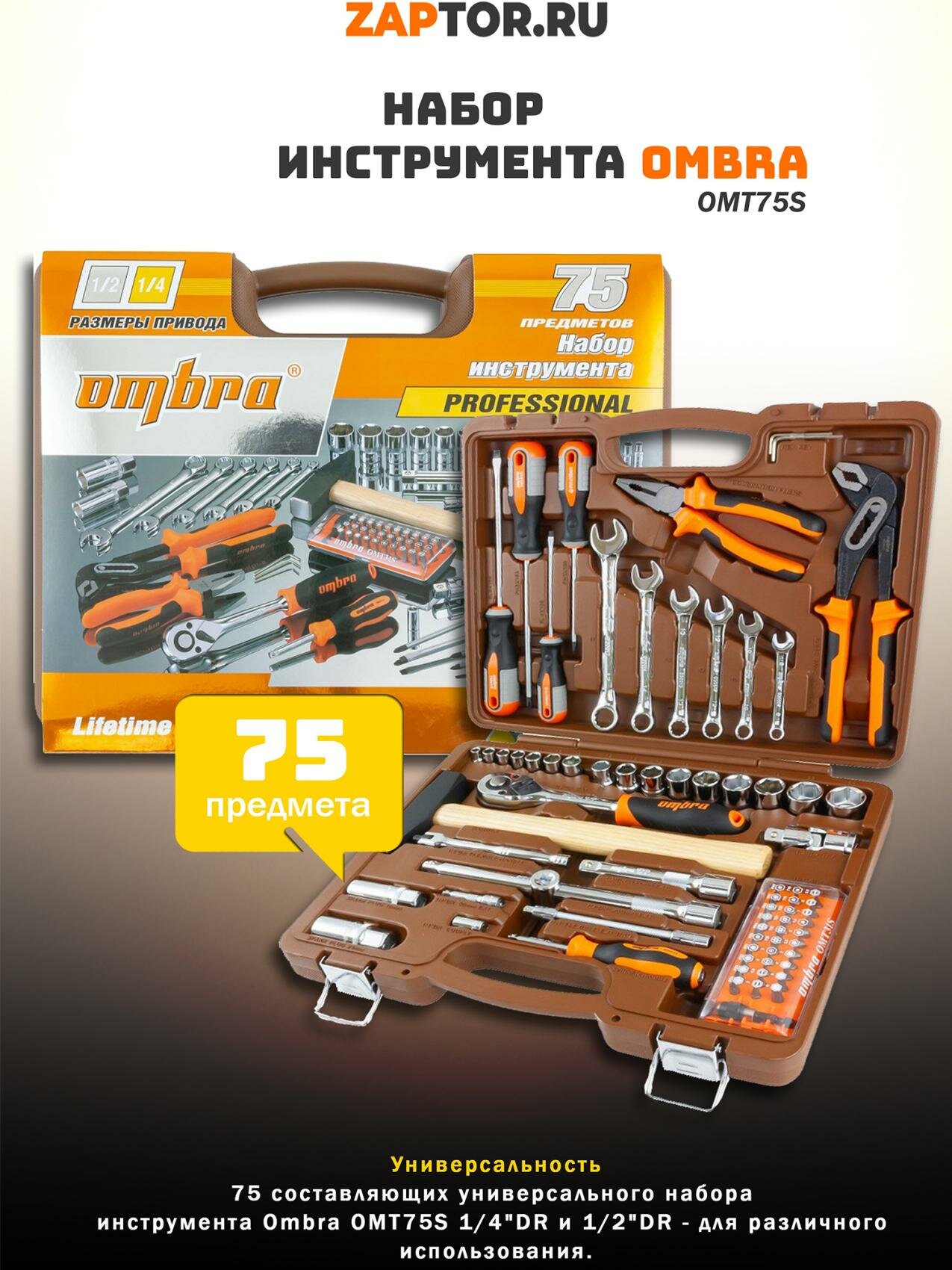 Набор инструмента универсальный 1/4", 1/2"DR, 75 предметов OMBRA / арт. OMT75S - (1 шт)