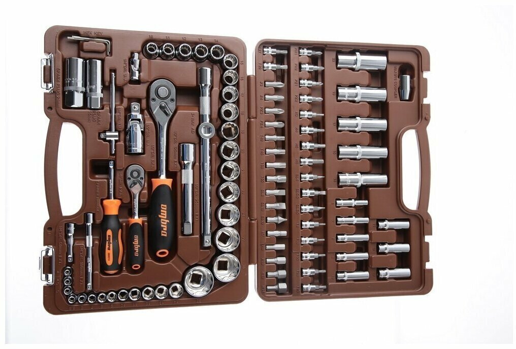 | Дополнительная информация | в комплекте: рукоятка трещоточная 1/4" 72 зубца, вороток Т-образный 1/4" 120 мм, удлинитель 1/4": 50, 100 мм, шарнир карданный 1/4", рукоятка отверточная 1/4", рукоятка трещоточная 1/2" 72 зубца, шарнир карданный 1/2", удлинитель 1/2": 125, 250 мм, переходник для вставок-бит 1/2"DR*5/16"HDR, переходник 3-х сторонний 1/2"; возможно несколько вариантов дизайнов ручек |