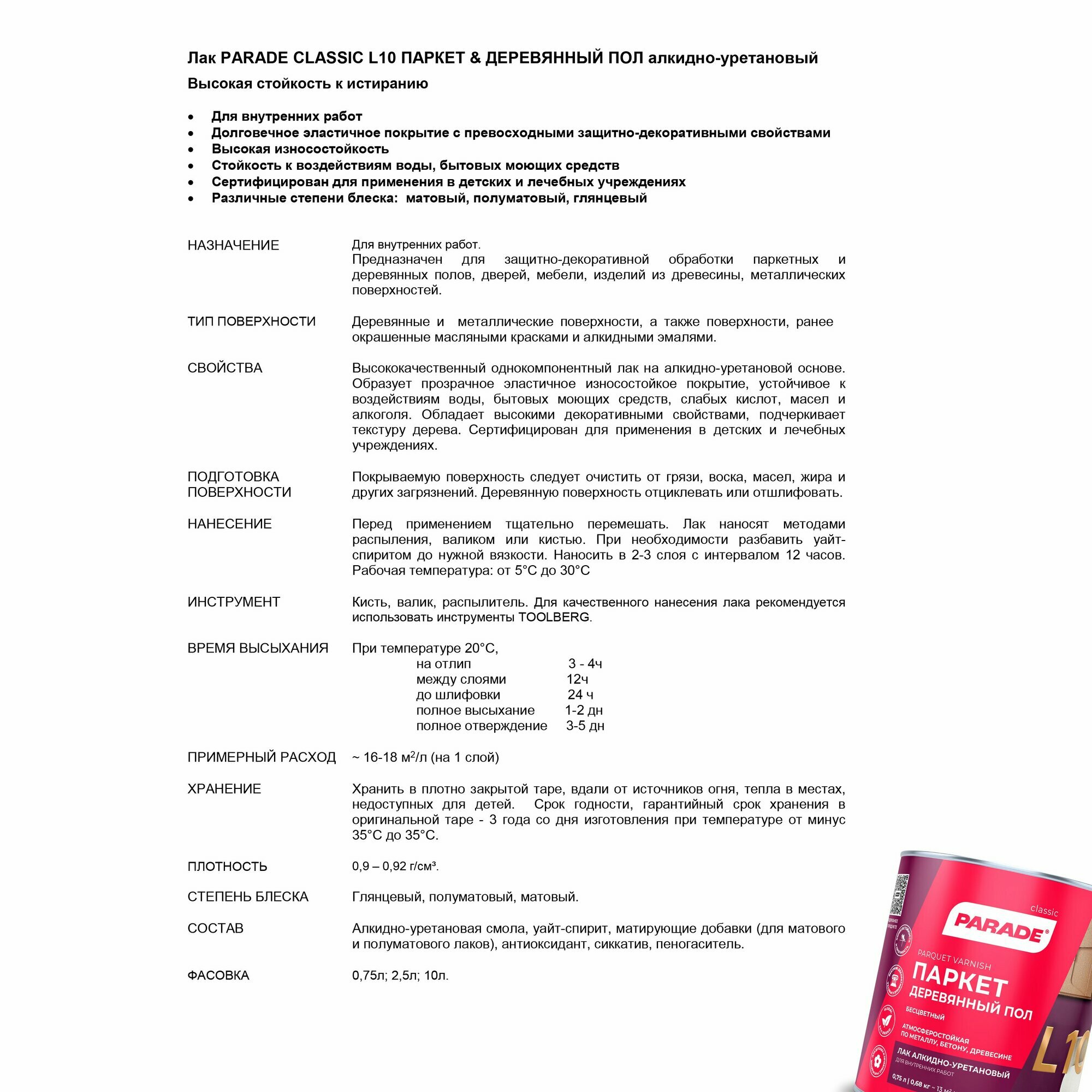 Паркетный лак Parade Classic L10 (Параде Классик Л10), (10.00л.) матовый