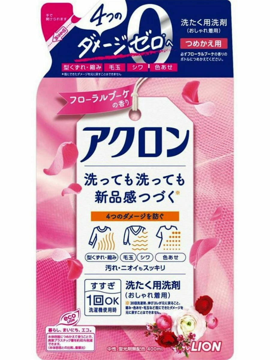 LION Жидкое средство для стирки ACRON деликатных тканей, шерсти, аромат цветов, 400 мл. сменная упаковка