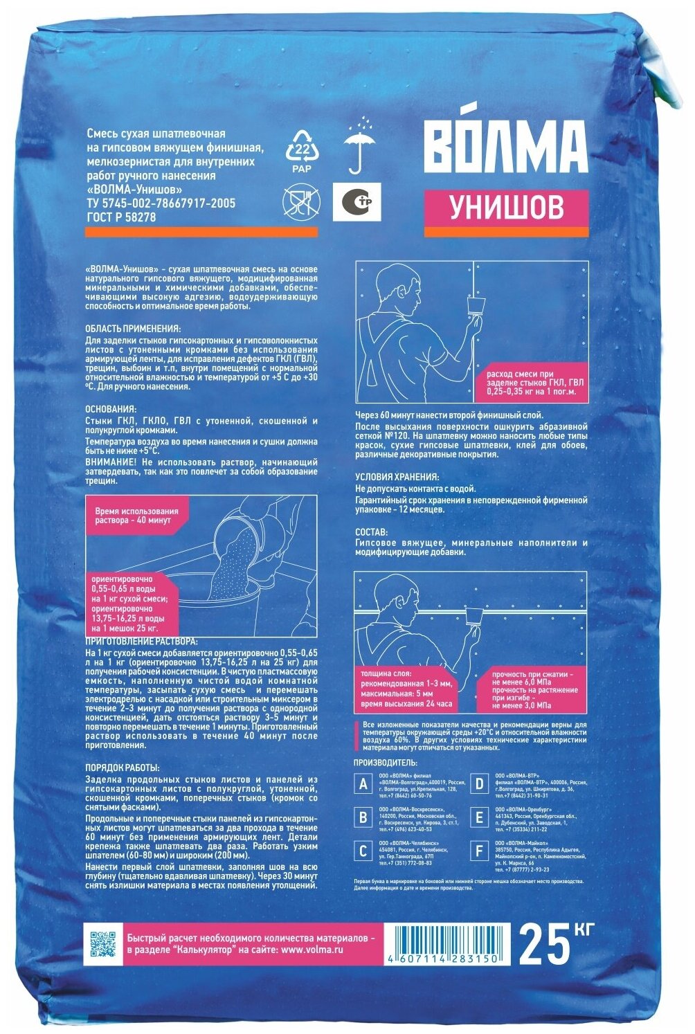 Волма Унишов шпатлевка гипсовая высокопрочная (25кг) / волма Унишов шпаклевка гипсовая для заделки стыков, ГКЛ, ГВЛ (25кг)