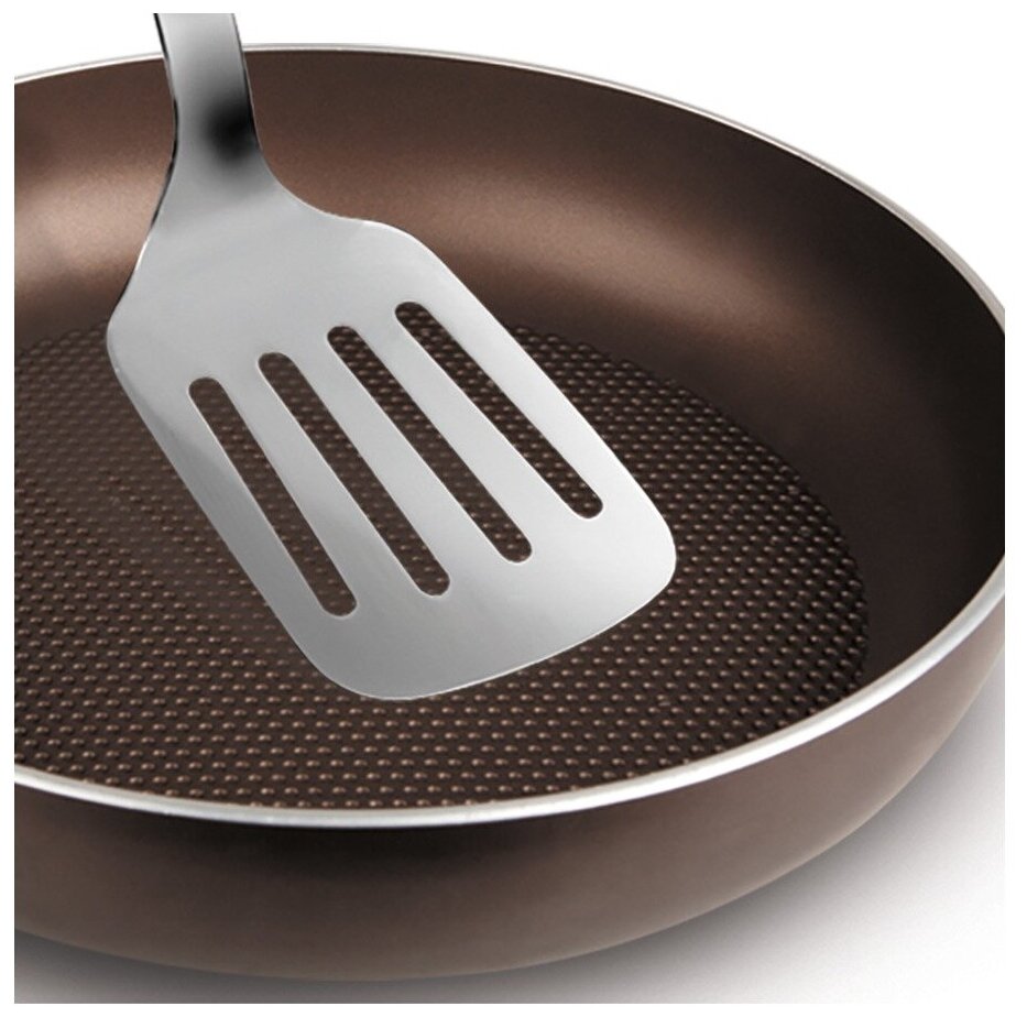 Выглядит замечательно! Красивый коричневый цвет с золотистыми микроблестками, рельефное дно. Удобная ручка с приятным покрытием Есть петля подвесить на крючок. Отлично моется. Пользуюсь ей чуть больше месяца, состояние покрытия идеальное - готовлю на ней практически каждый день. Уже прикупила ей сестренку диаметром 20 см, так они мне нравятся. Сковорода нагревается достаточно быстро. И достаточно долго сохраняет тепло после приготовления. Нужна совсем небольшая капля масла, чтобы ничего не пригорало и продукты скользили по поверхности. |