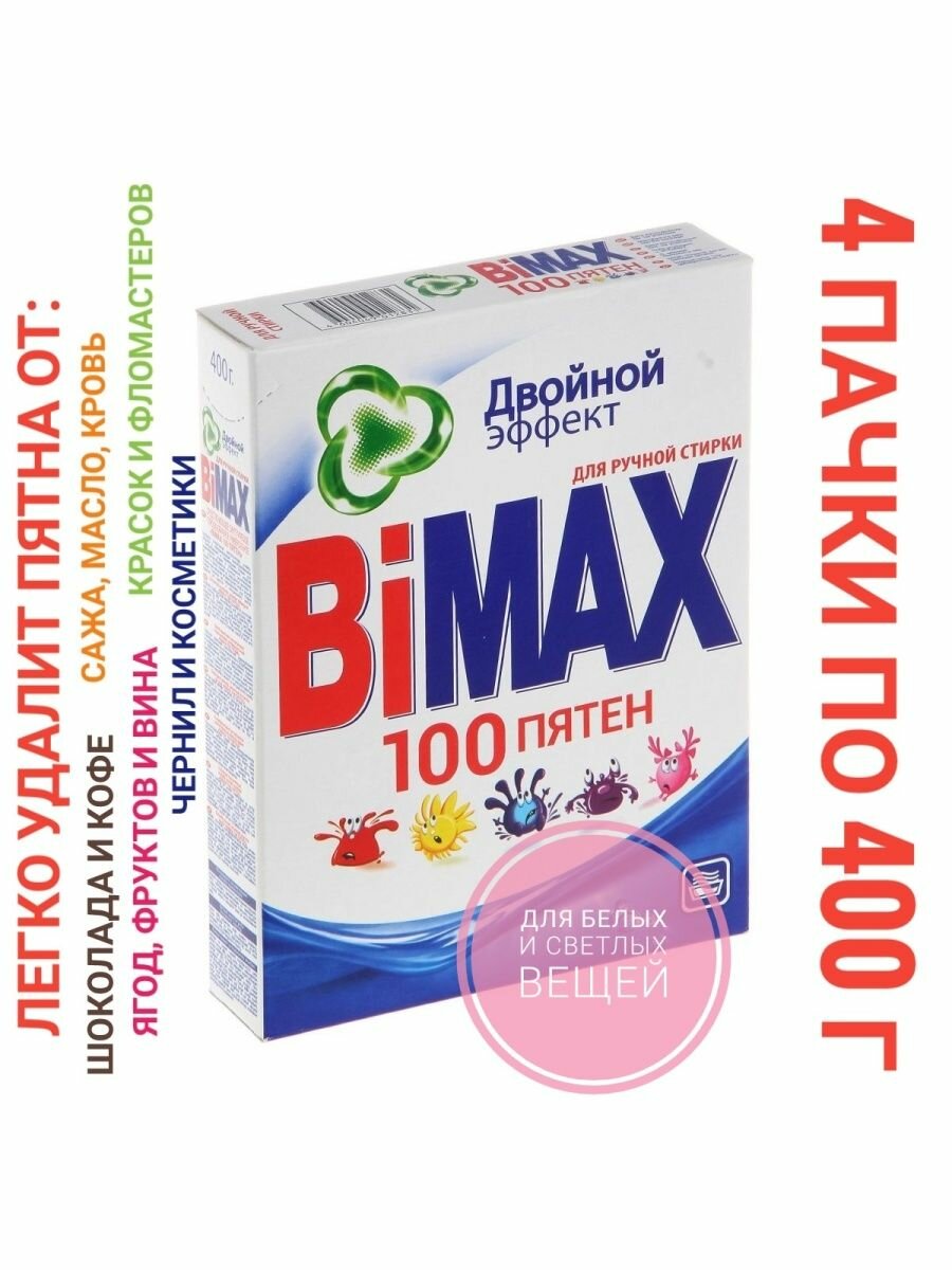 Стиральный порошок Bimax 100 пятен Compact (ручная стирка), 0.4 кг, 0.4 л, универсальное, для белых и светлых тканей, 4 шт.