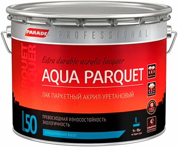 Лак Паркетный Parade Professional L50 Aqua Parquet 9л Полуматовый, Акрил-Уретановый, Бесцветный для Внутренних Работ / Парад L50