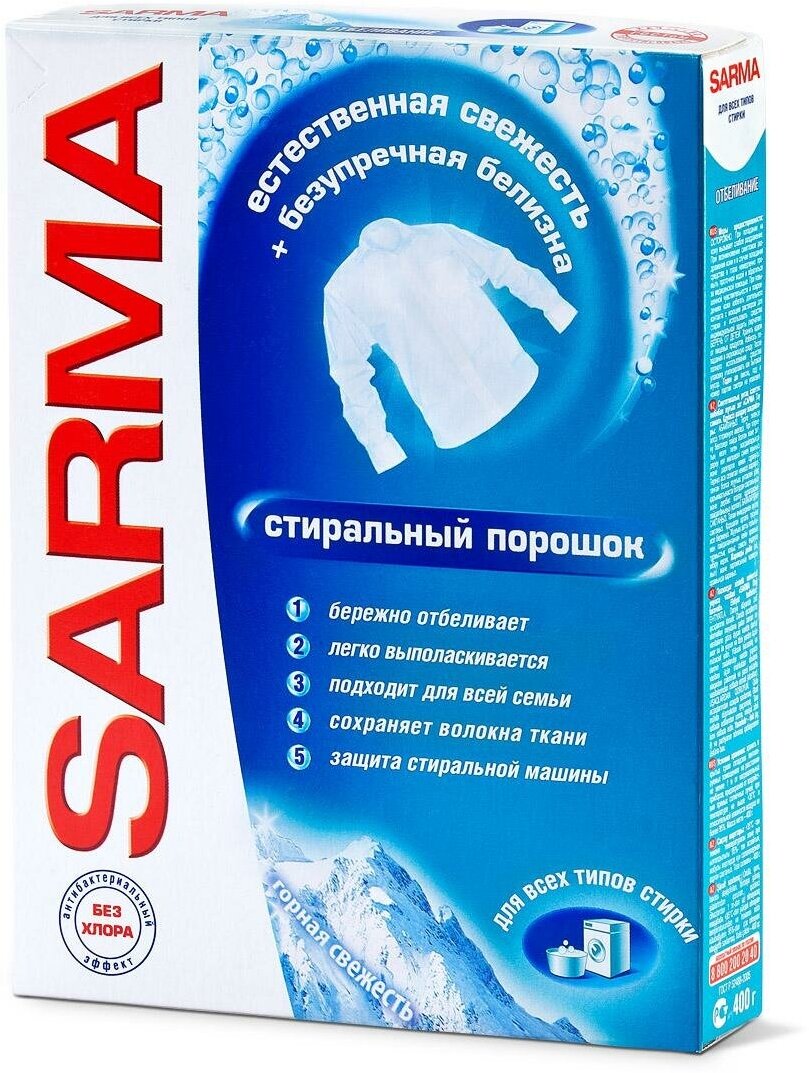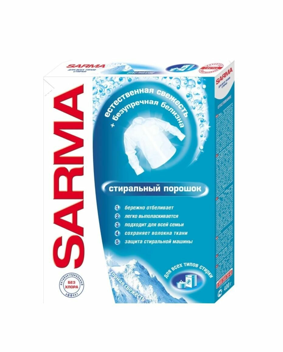 Стиральный порошок Sarma "Горная свежесть", свежесть + безупречная белизна, 400 г 1575640