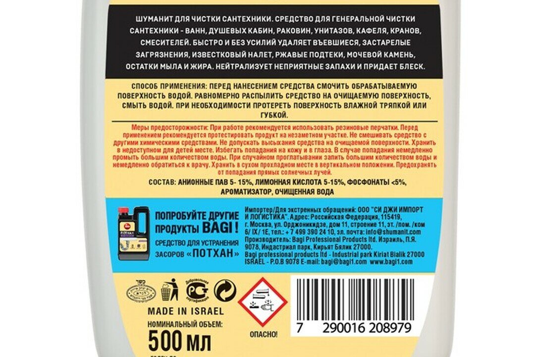 Чистящее средство Bagi для сантехники, Шуманит, 500 мл