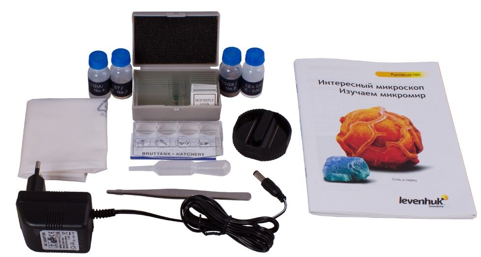 В комплекте идет несколько стекол с примерами, что можно увидеть в него. Но и самостоятельно подготавливать/покупать новые никто не мешает. Питание как от сети так и от батареек. Отличный свет, в том числе верхний для непрозрачных объектов. |