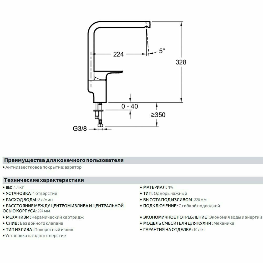 | Высота излива | 328 мм |