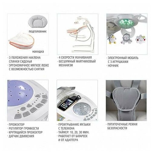 Таймер, встроенные мелодии, ночник, ремни безопасности