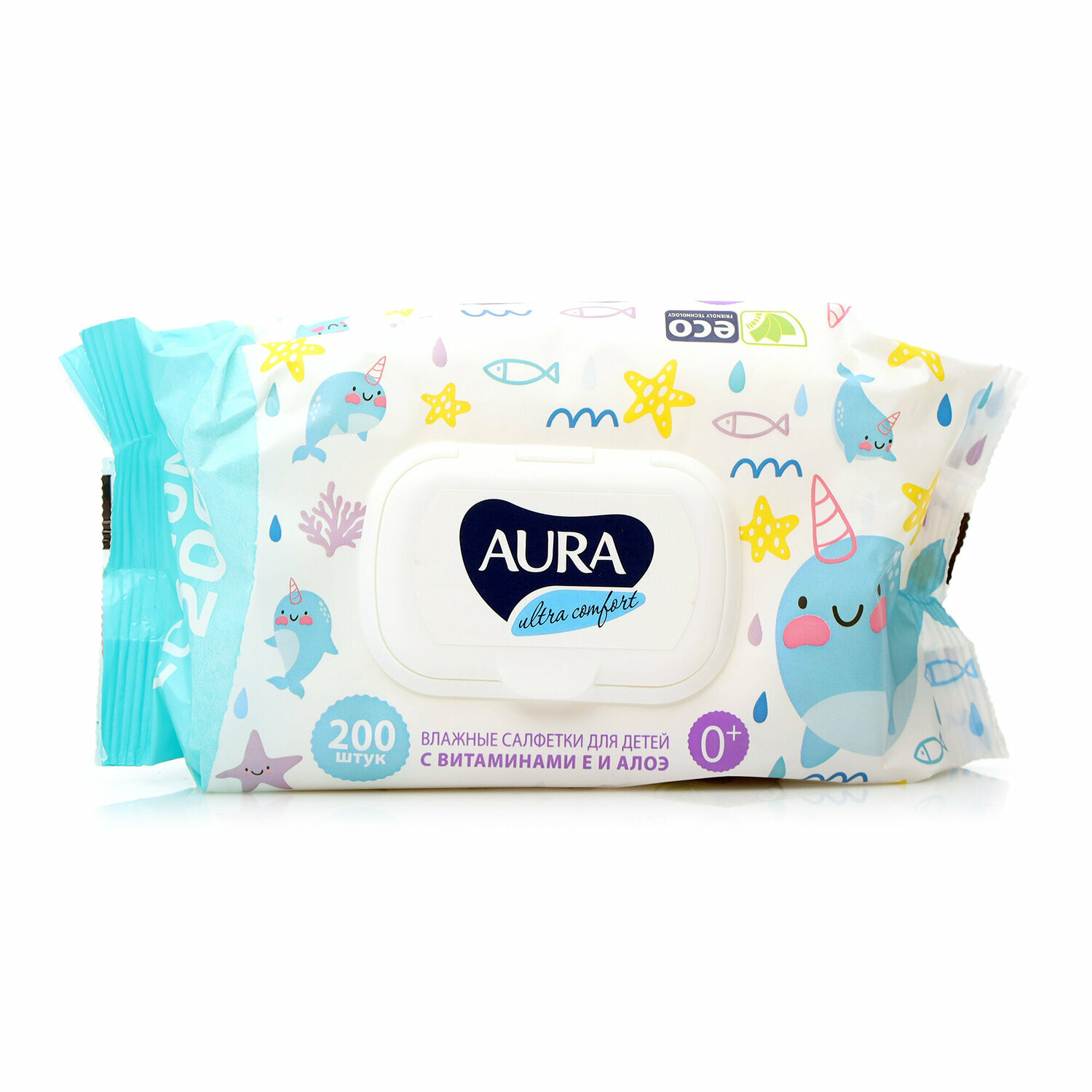 AURA Ultra Comfort Влажные салфетки детские с экстрактом алоэ и витамином Е с крышкой 0+ 120 шт