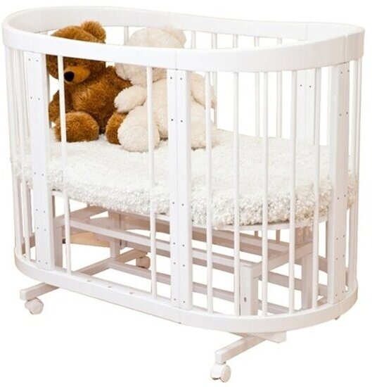 Собрали люльку и для пеленального столика не оказалось 4 гаек-боченков. Также минус в том, что колеса в комплекте к белой кроватки оказались серыми (а ни как на фото). Колеса со стопорами, среднего качества. И конечно же огорчила трещина на боковой стойке. Сама кроватка покрыта эмалью (белая), выглядит гораздо приятнее дешевых аналогов. Пока не эксплуатировали, ждем. Надеюсь что в процессе эксплуатации не развалится. Маятниковые механизмы и для люльки и для овальной кроватки. Возможно установить просто на пол без маятника. Прутья из боковых стенок извлекаются. |