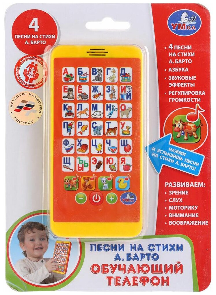 Игрушка музыкальная Телефон "Азбука А. Барто", звуковые эффекты, стихи, песенки, работает от батареек, Умка HX2501-BA интересное: