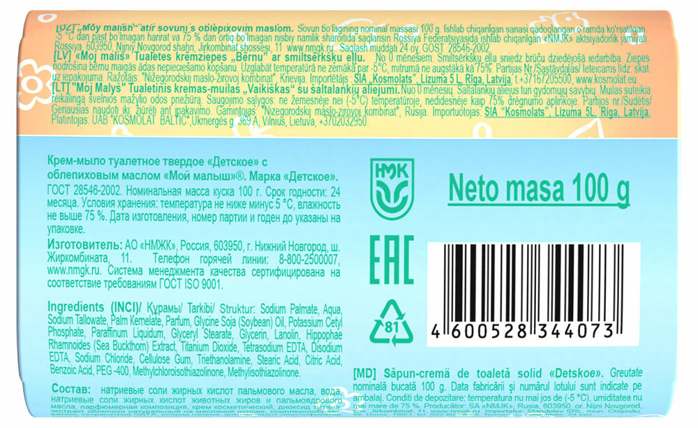 Крем-мыло твёрдое нмжк Мой Малыш 100г Облепиха гипоаллергенно
