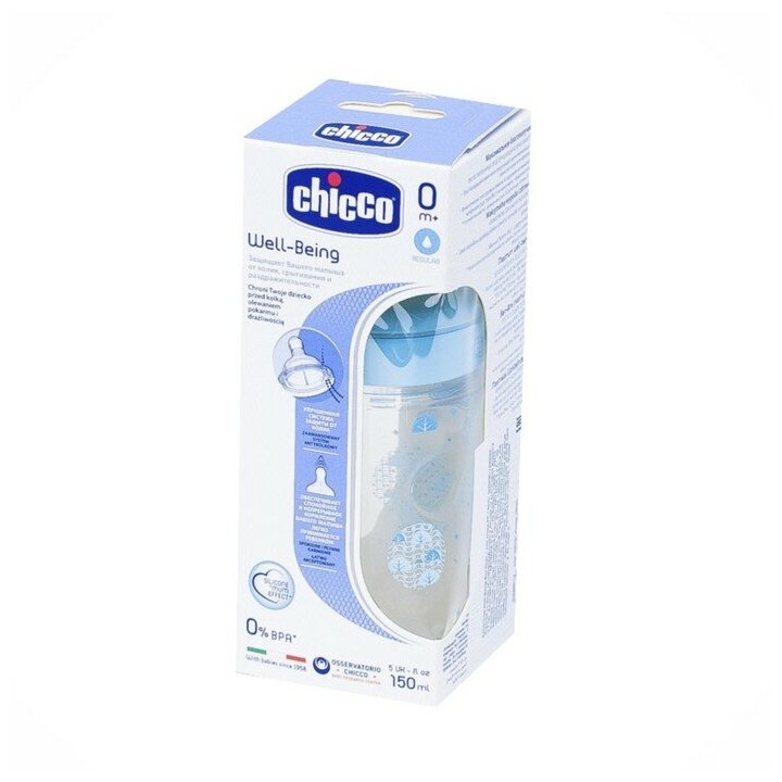 Бутылочка для кормления с соской из силикона Chicco Well-Being, 150 мл boy/girl, 0 мес+, голубой