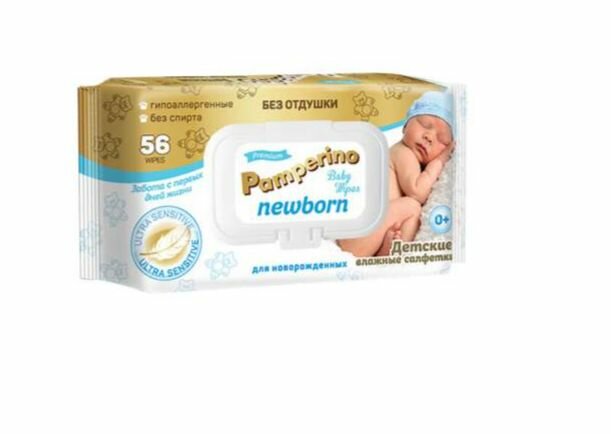 Влажные салфетки Pamperino Newborn, пластиковая крышка, 56 шт.