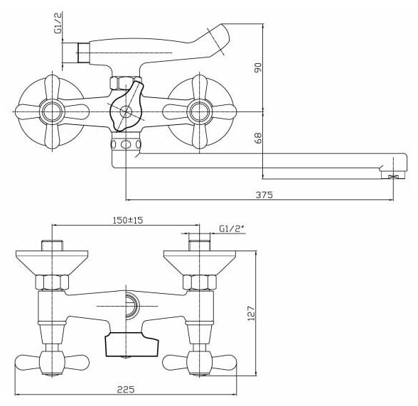 2225HB Смеситель Ванна HAIBA 1/2 м/к крест длинный излив шаровое переключение в корпусе хром