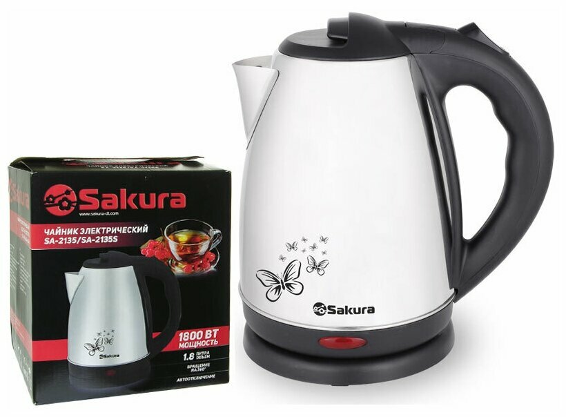 Чайник SAKURA SA-2135 S (1.8 кВт, 1.8 л, ЗНЭ) глянец, нерж.корпус, бабочки