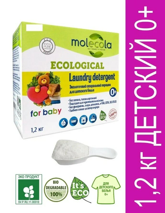 MOLECOLA Экологичный ст-ный порошок с рас-ми энзимами д/стирки белого и цветного детского белья 1,2кг