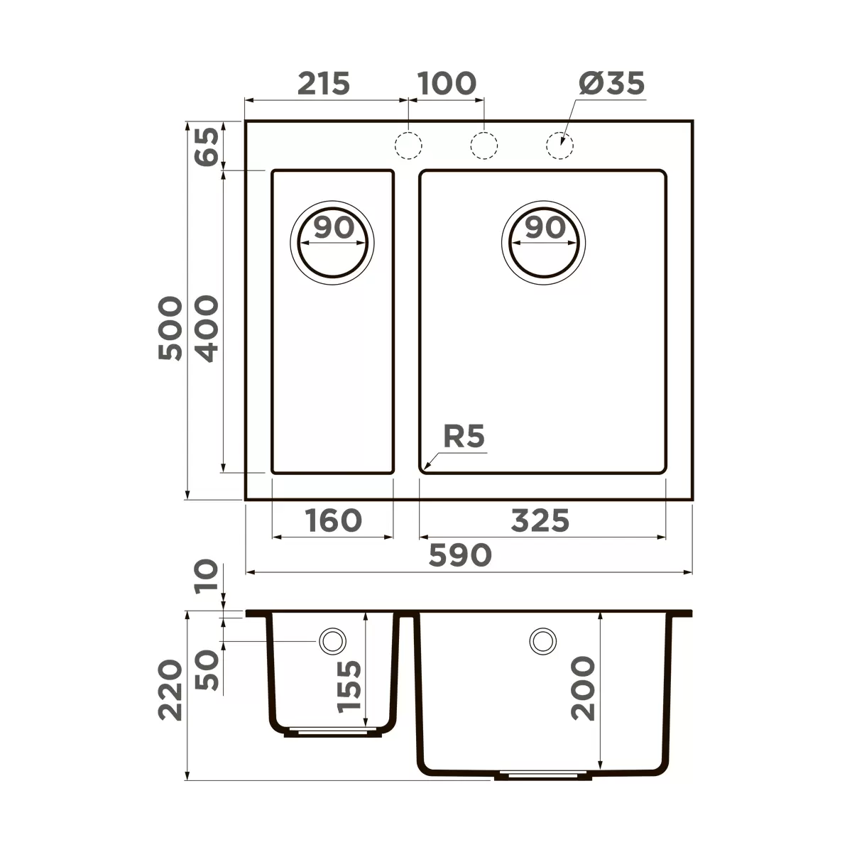 Кухонная мойка двухчашевая OMOIKIRI Bosen 59-2-BL, искусственный гранит/черный/основная чаша справа