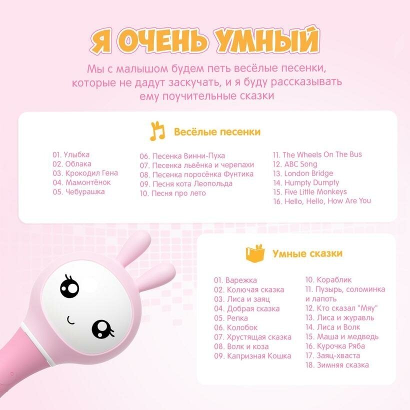 | Отзыв: | Помимо всех перечисленных выше плюсов хочется отдельно отметить мимимишность зайца: управление громкостью происходит с помощью шевеления хвостика, мордочка вызывает у ребёнка умиление и желание улыбаться в ответ. Ушки светятся очень мягко и тоже привлекают внимание.