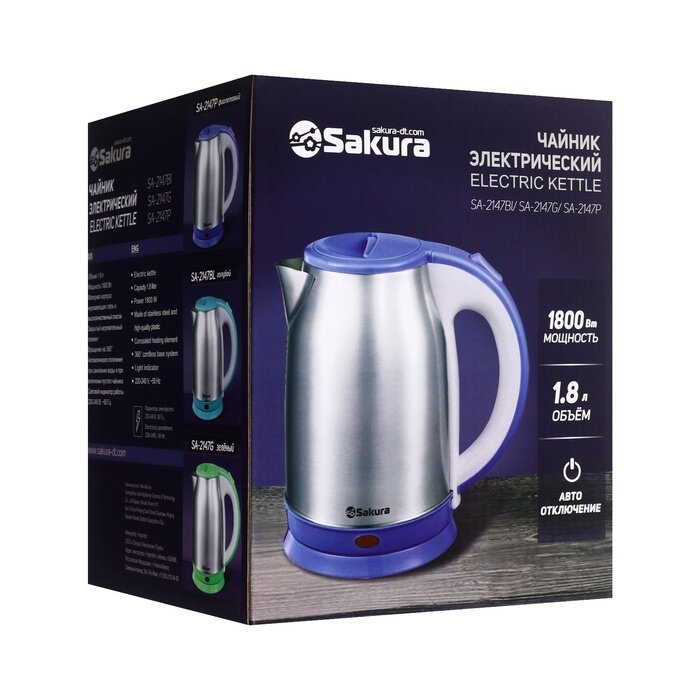 SAKURA Чайник электрический Sakura SA-2147BL, металл, 1.8 л, 1800 Вт, голубой