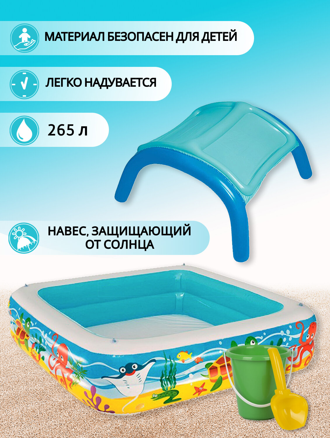 Бассейн детский c надувным бортом 140х140х114 см, 265 л, с навесом от солнца 52192