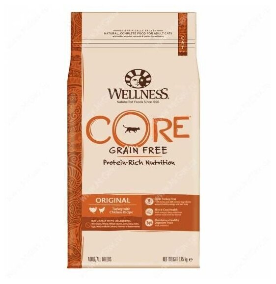 Корм для кошек сухой Веллнес Кор ORIGINAL для взрослых животных гранулы с индейкой и курицей 1.75кг / кошачья еда гипоаллергенная для ежедневного
