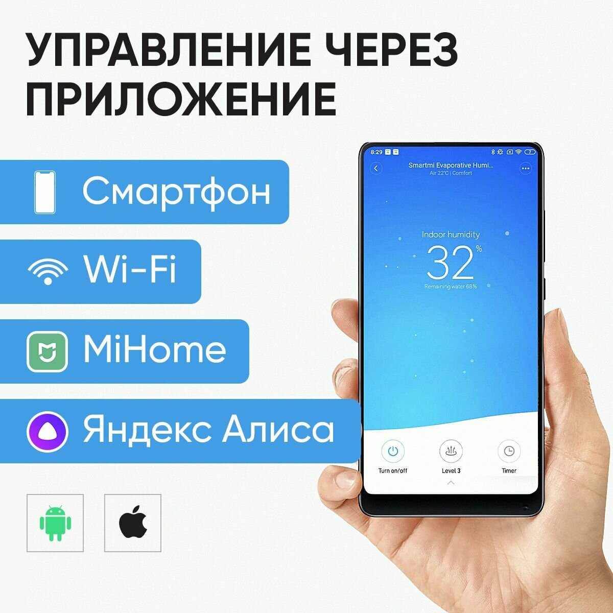 Действительно работает с Алисой! Имея Яндекс. Станцию можно просто сказать "Алиса, включи\выключи увлажнитель, поставь на максимальную\минимальную скорость". Красивое и удобное управление через Mi Home. Можно автоматизировать через сценарии и легко интегрировать в систему умного дома. |