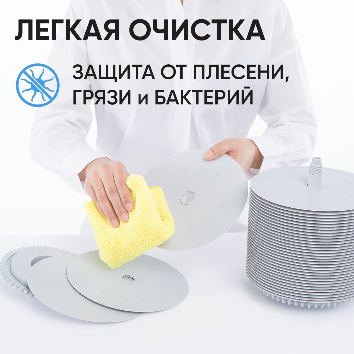 | Минусы: | Чтобы удержать в комнате влажность, приходится держать дверь и окна закрытыми. Долго мыть диски. Цена за ведро с вентилятором высока, но по сравнению с аналогами вполне доступно. |