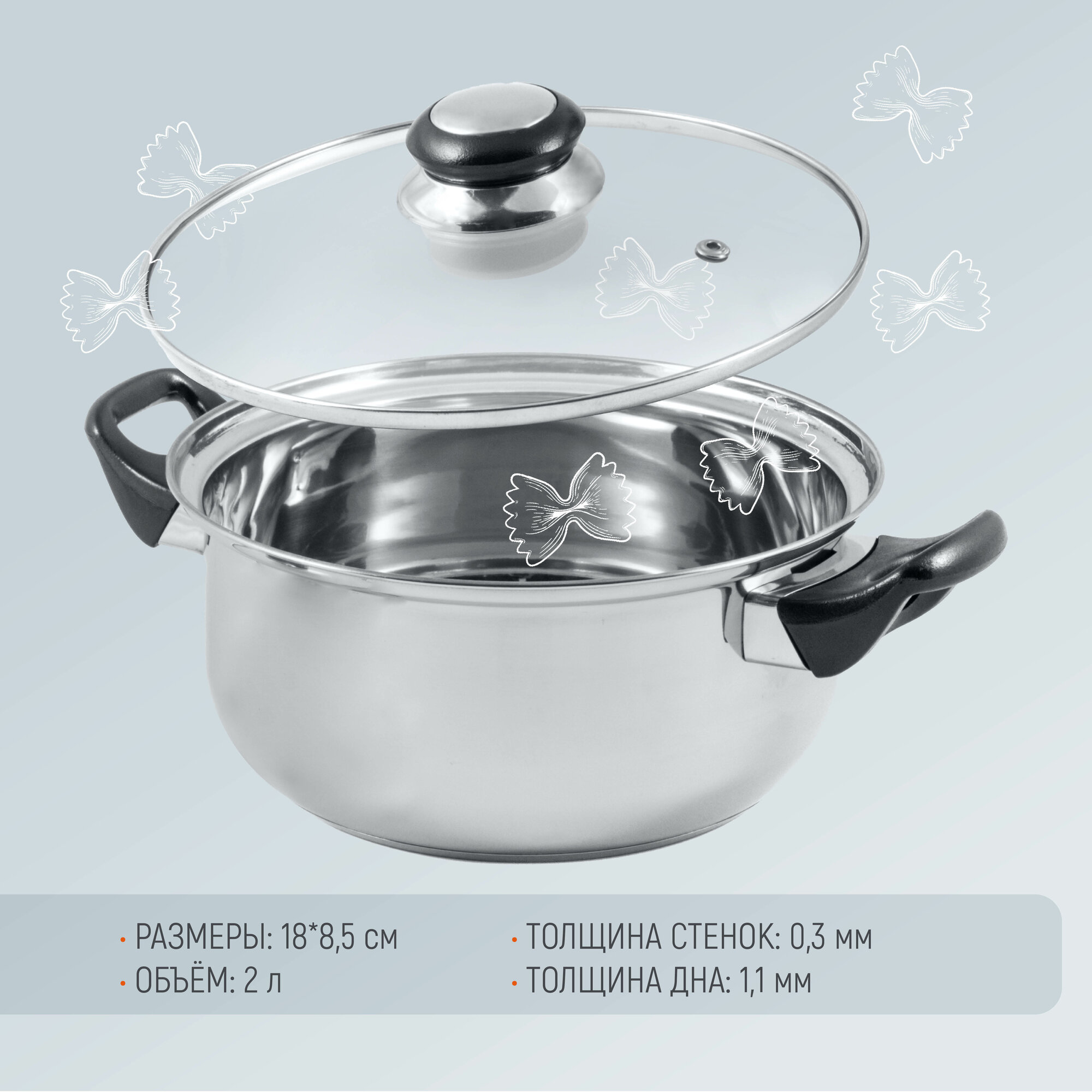 Кастрюля из нержавеющей стали с крышкой (стекло) BAK-02, 2 л