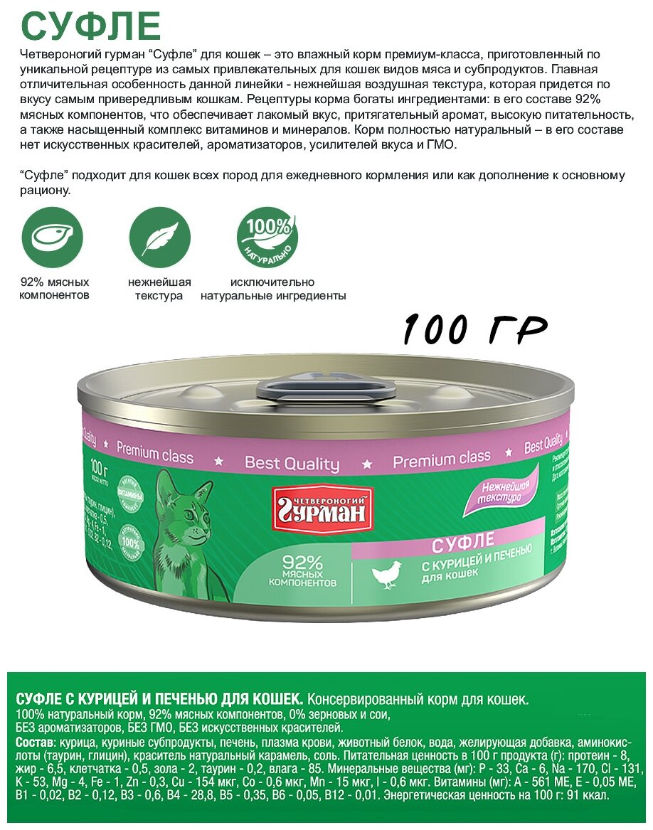Четвероногий гурман суфле для взрослых кошек с курицей и печенью (100 гр х 24 шт)